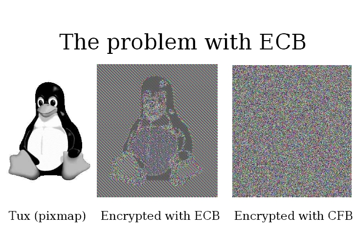 Porque se dois blocos de texto original forem iguais, os blocos cifrados também serão idênticos. E isso revela padrões visíveis. Já viu aquela imagem do pinguim Tux cifrada com AES-ECB? Ainda dá pra ver o pinguim!