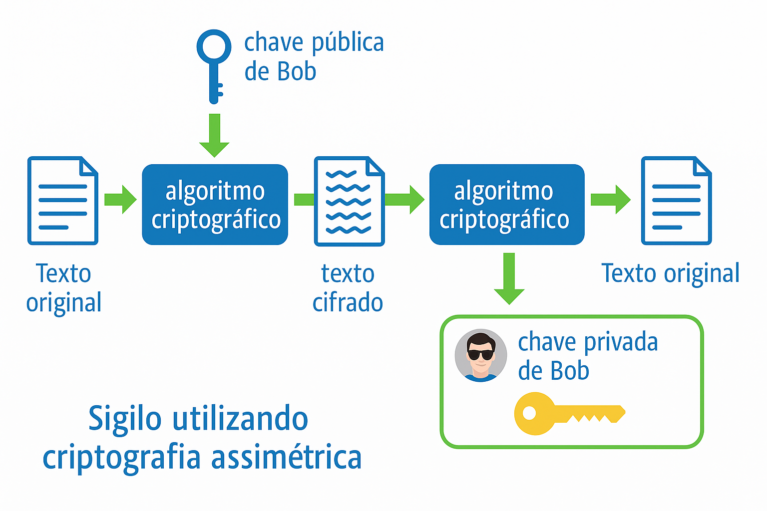 Alice quer enviar um e-mail para Bob e garantir que apenas ele possa ler a mensagem. Ela usa a chave pública de Bob para criptografar a mensagem.