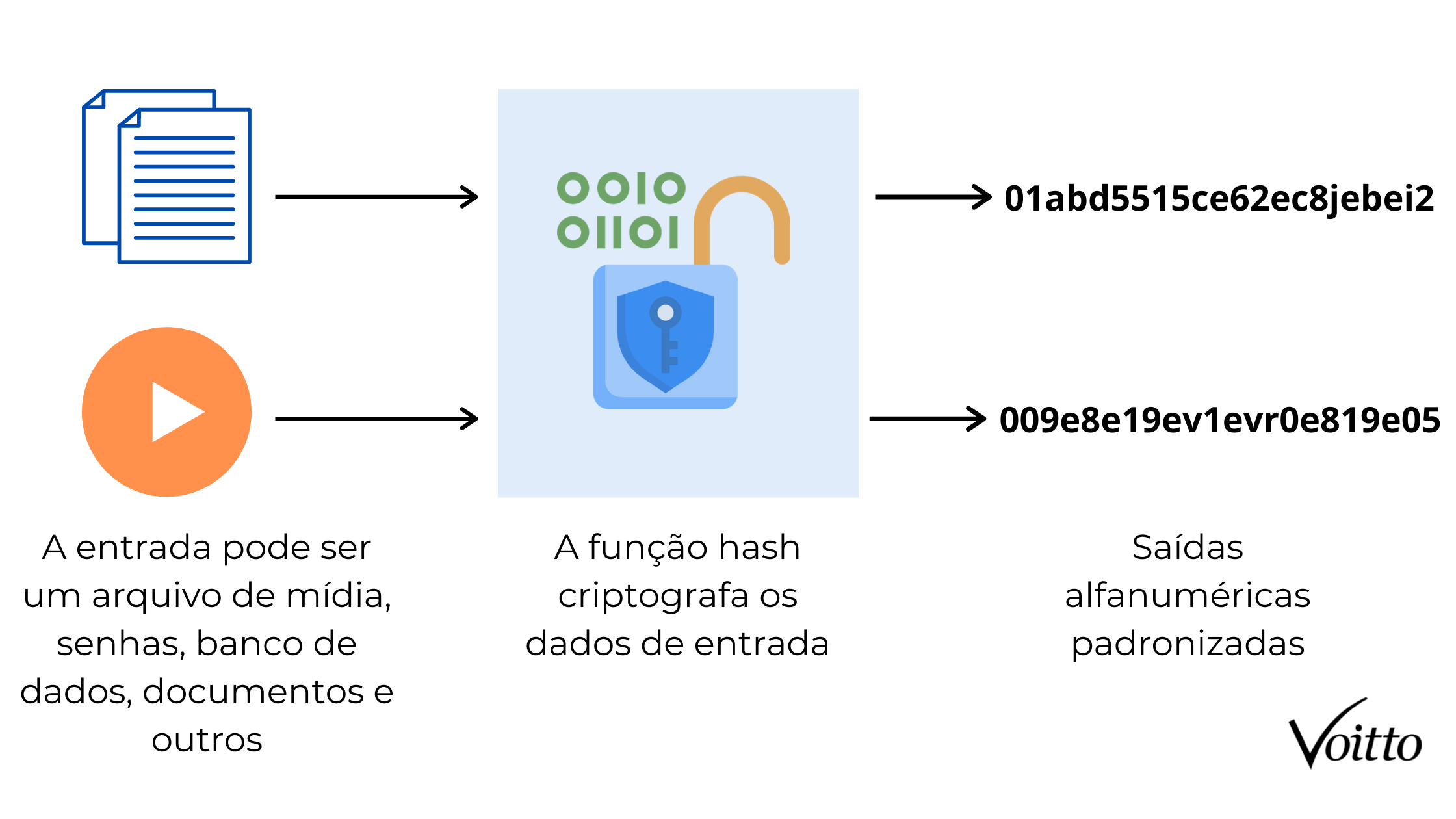 Saída: um valor fixo (por exemplo, 64 caracteres hexadecimais em SHA-256).